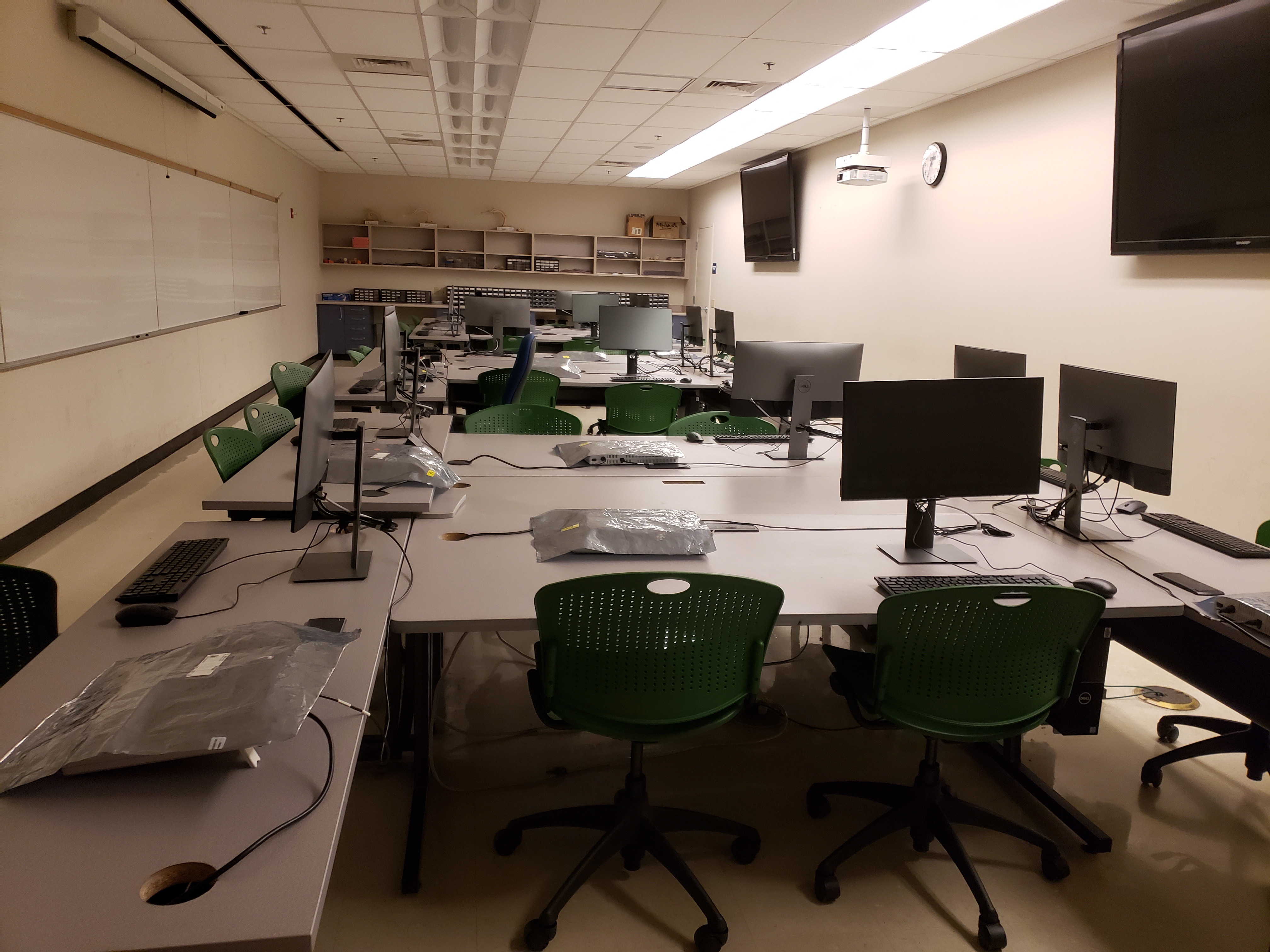 The lab in room 311 houses 35 Dell T5400 PCs running Linux. A Windows XP VMWare image is accessible via VMPlayer and is loaded with computer science specific software (MatLab, LabView, Simulink, OpenGL, and MSDN Software Engineering packages, SQL Server). All machines are optimized for graphics work, with 22" flat panel monitors. Room 311 is equipped with an overhead projector and projection screen for data, video, DVD, and VHS. This room is also optimized for Java platform development and is used for summer outreach in Java for local high school students.